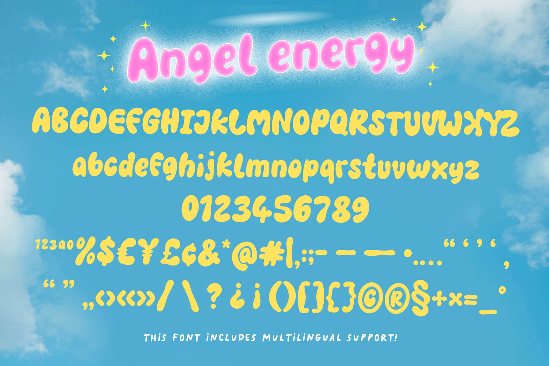 Say hello to Angel Energy! A bubbly little font that is voluptuous and curvy in all the fun ways! Inspired by y2k graphics however it can be very versatile so take a peek at the previews above to get inspired!
